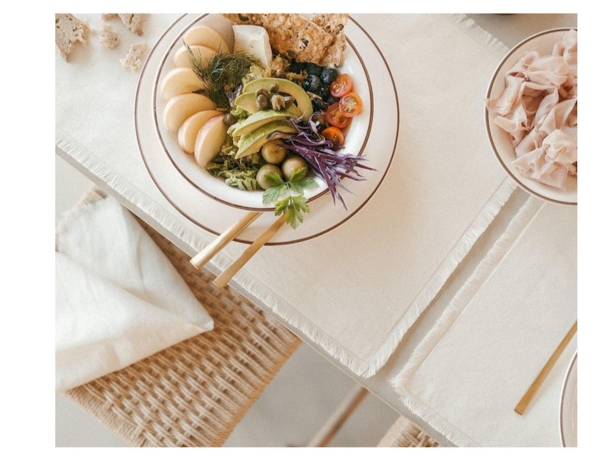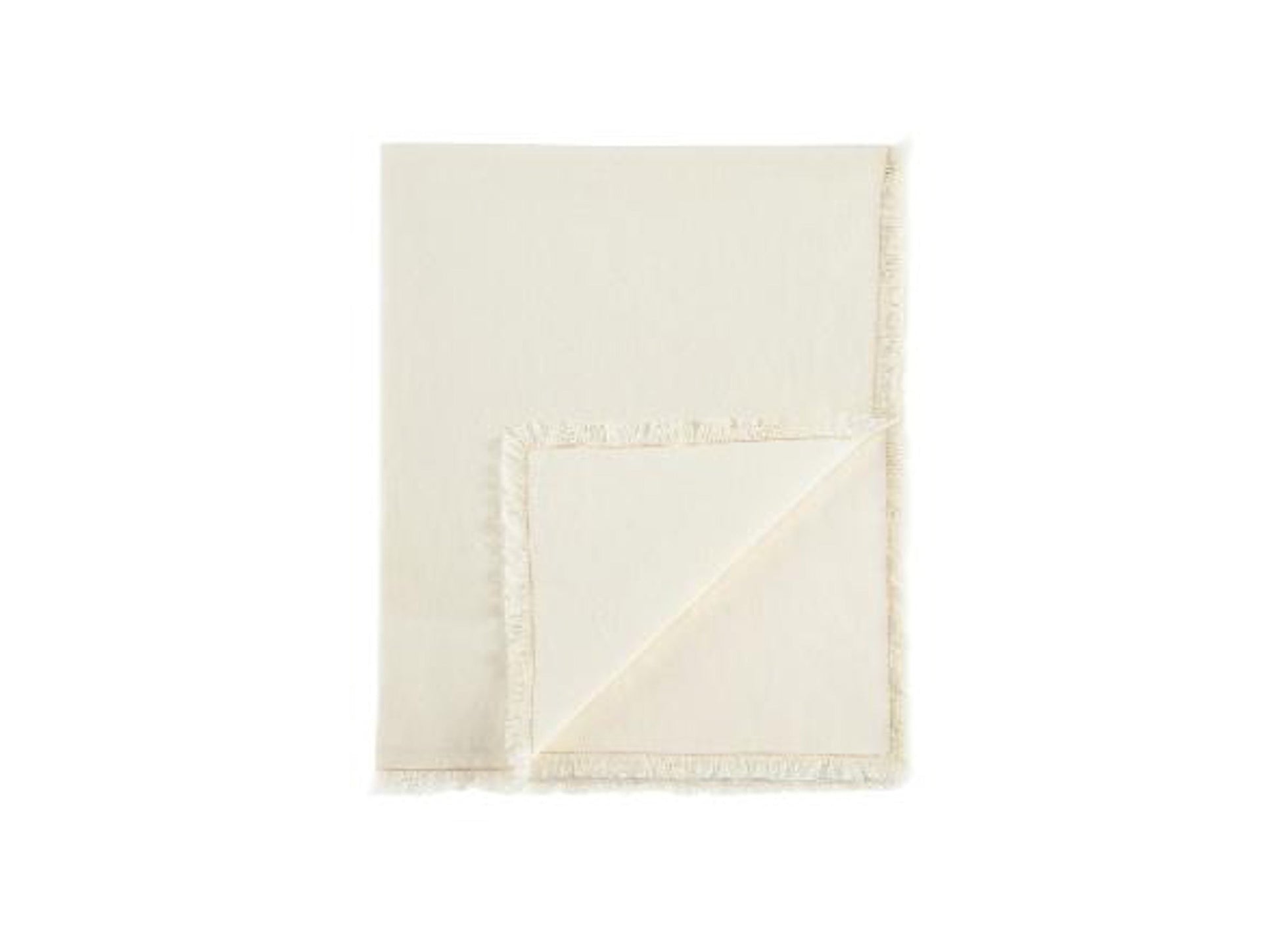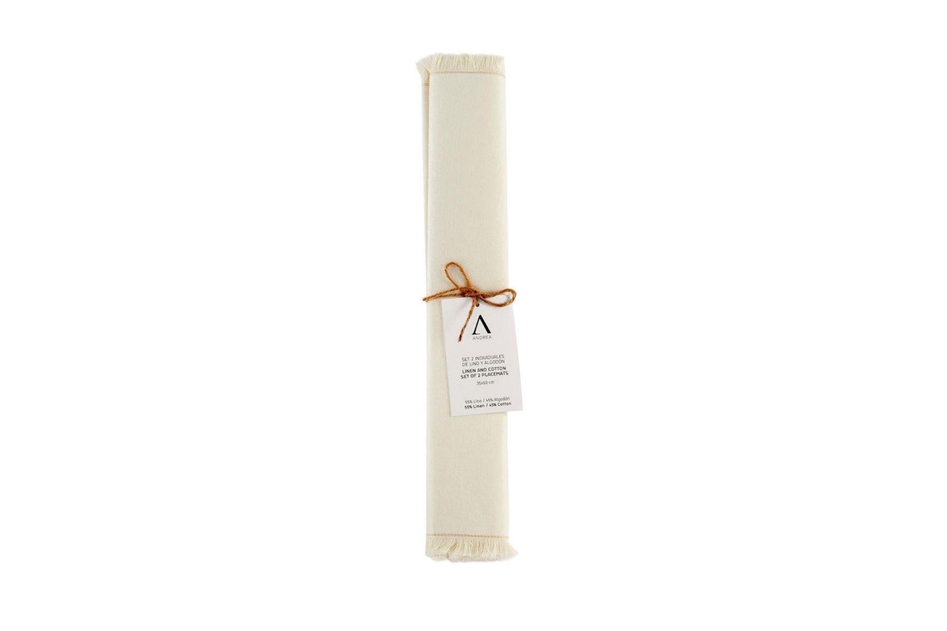 Set aus zwei weißen Tischsets aus Leinen und Baumwolle. Rechteckige Form, dicker Stoff und Fransenabschlüsse. Klassisch und modern im Stil, passen sie in jede Küche oder jedes Esszimmer.