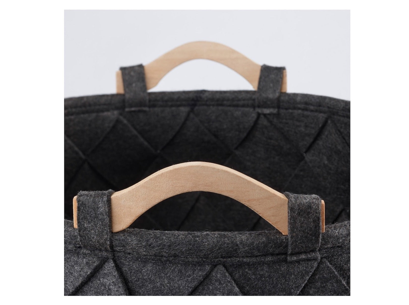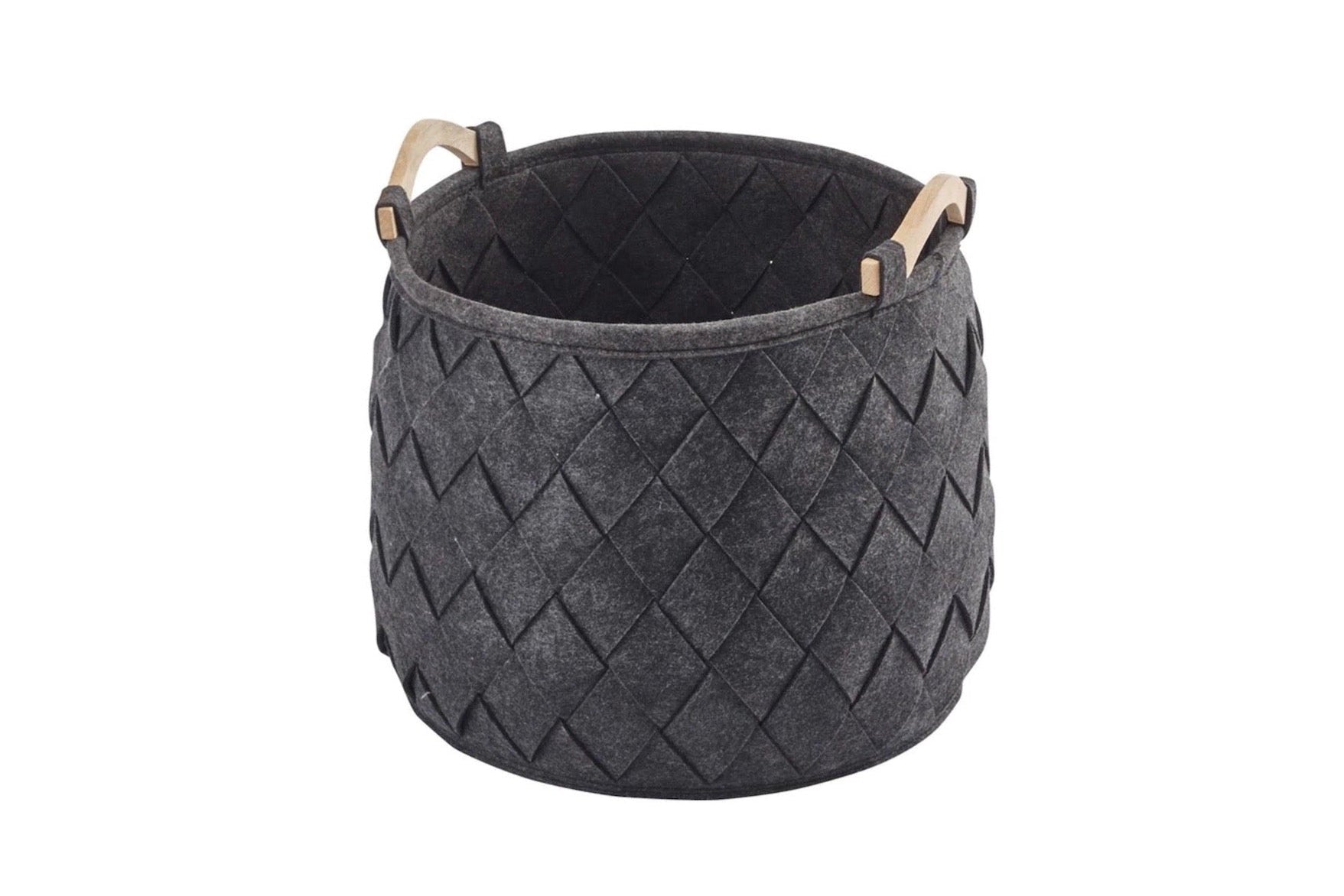 Robuster Aufbewahrungskorb aus 100 % Polyesterfilz mit Handgriffen aus Fichtenholz. Der Filz ist 3 mm dick. Dieser anmutige Blickfang hat eine geflochtene Struktur und wertet Ihre Inneneinrichtung auf.