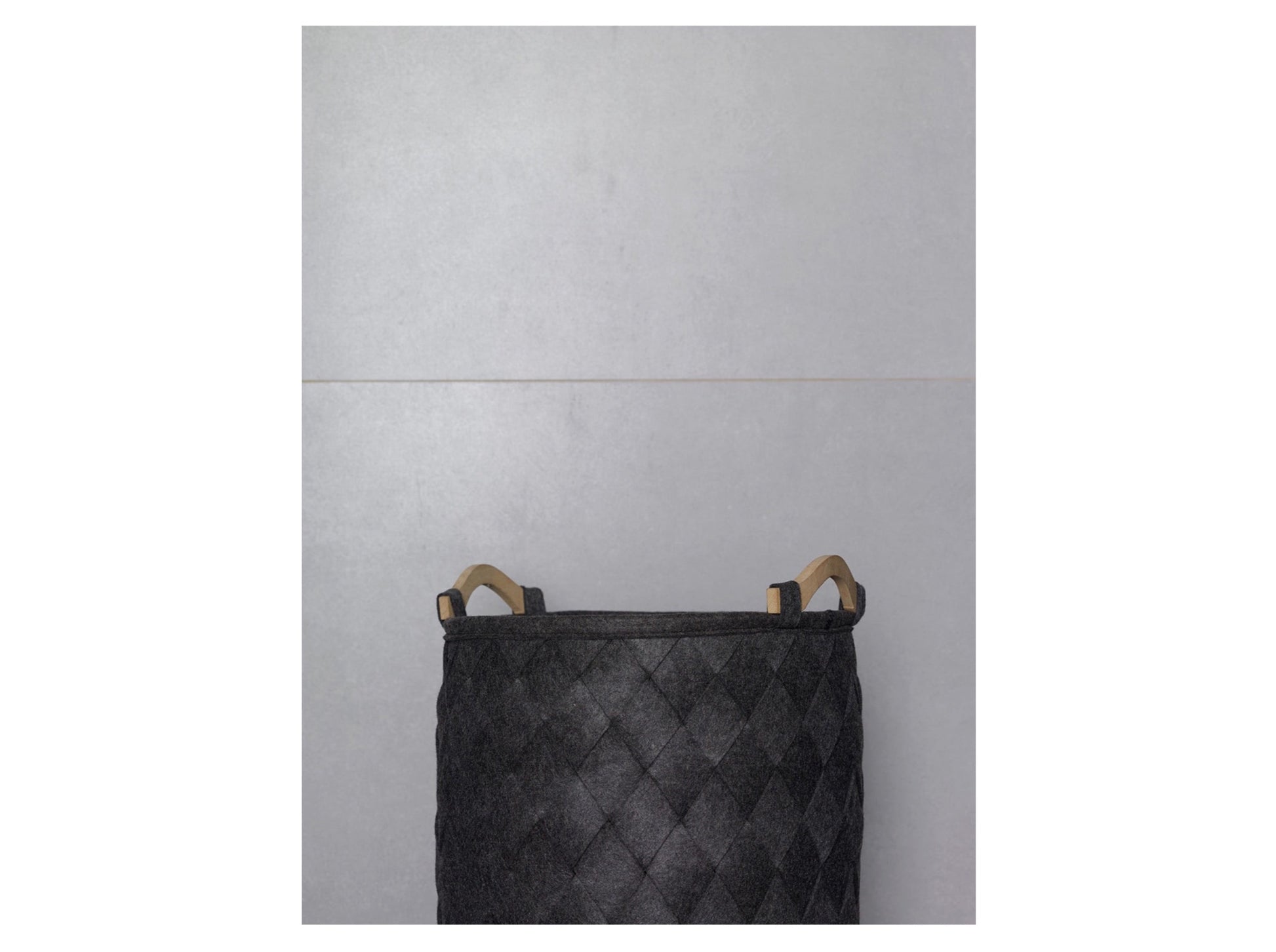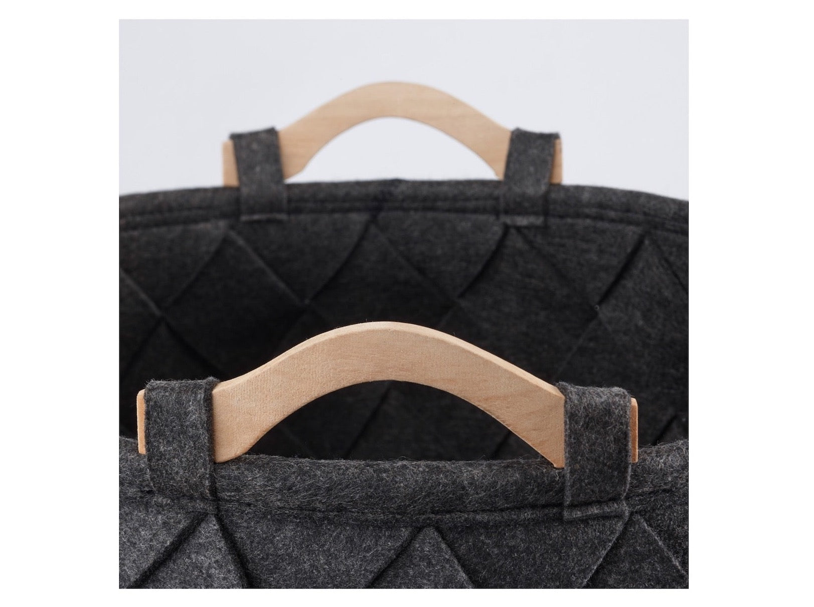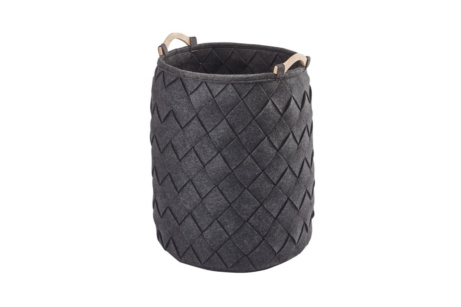 Robuster Wäschekorb aus 100 % Polyesterfilz mit Handgriffen aus Fichtenholz. Der Filz ist 4 mm dick. Dieser anmutige Blickfang hat eine geflochtene Struktur und wertet Ihr Badezimmer auf.