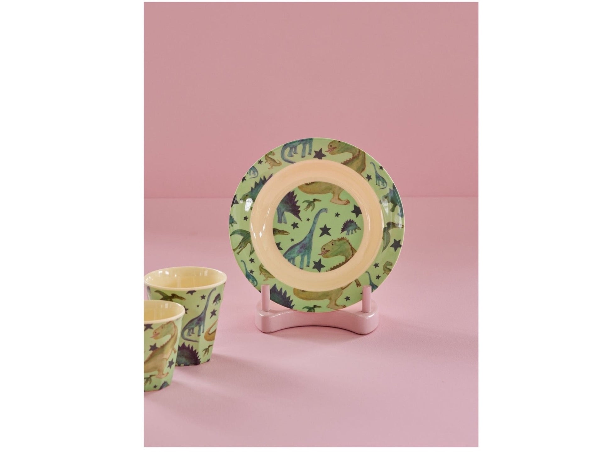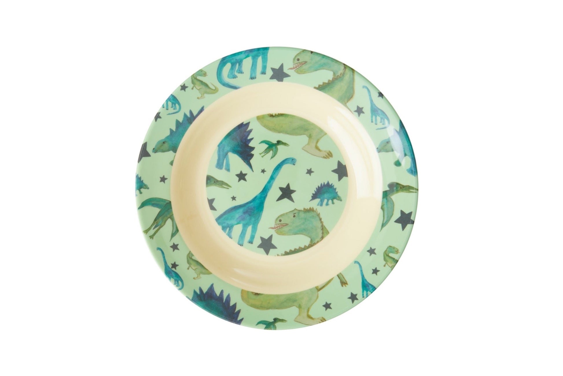 Cooler Melaminteller für Kinder mit Sternen und wilden Dinosauriern. Dieser tiefe Teller ist eines unserer absoluten Lieblingsprodukte - und wir sind ziemlich sicher, dass er auch zum Liebling deines Kindes wird! Er passt perfekt zu jeder Mahlzeit und jeder Gelegenheit sowohl drinnen, als auch draußen. Verwenden ihn ganz nach deinen Bedürfnissen!