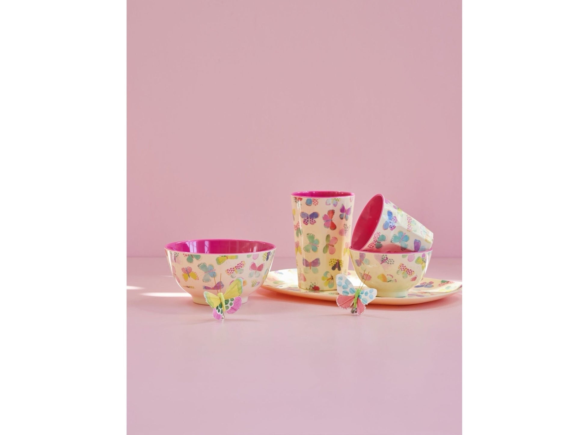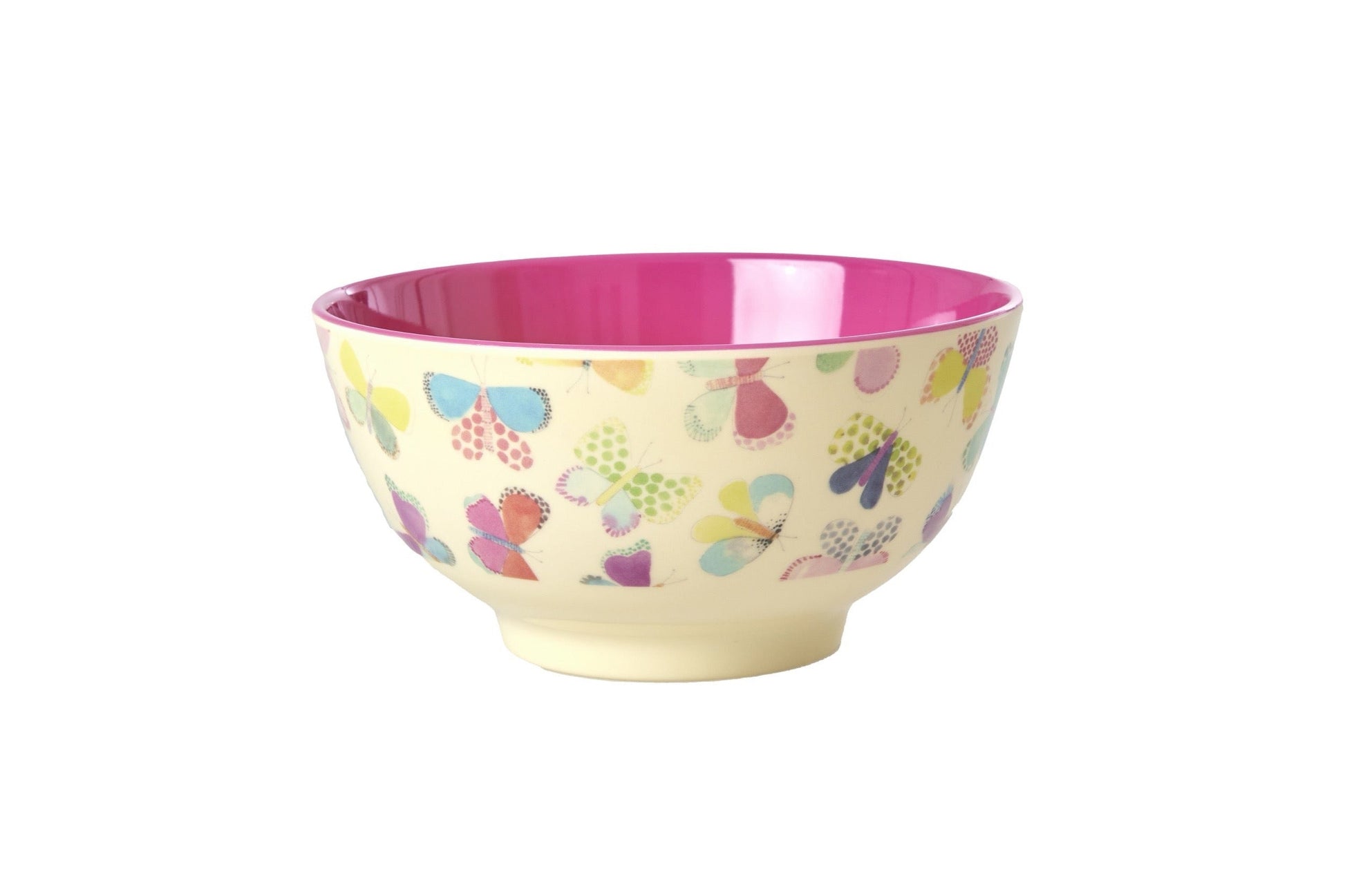 Hübsche mittelgroße Melaminschale in schönen Farben – innen rosa und außen mit bunten Schmetterlingen. Die Schüssel eignet sich perfekt für Frühstück, Suppe, eine kleine Blume oder Süßigkeiten am Freitagabend. Du kannst sie so vielseitig einsetzen.