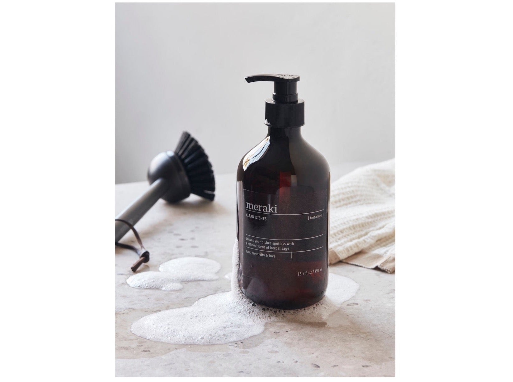 Dieses Spülmittel von Meraki heißt Herbal Nest und wurde mit dem Ökolabel Nordischer Schwan ausgezeichnet. Da es besonders ergiebig ist, reichen schon ein paar Tropfen für den Abwasch. Dank der praktischen Pumpflasche kannst du das Spülmittel immer genau nach deinen Bedürfnissen dosieren. Erfreue dich an dem nach Kräutern duftenden, weichen Schaum mit Noten von Salbei, Zitrus und Moschus. In der Flasche spielen Design und Funktionalität perfekt zusammen, sodass du sie bedenkenlos neben der Spüle stehen lassen kannst. Verwende 2 ml Spülmittel für 5 l Wasser. Das Spülmittel ist nicht für den Gebrauch in der Spülmaschine geeignet.