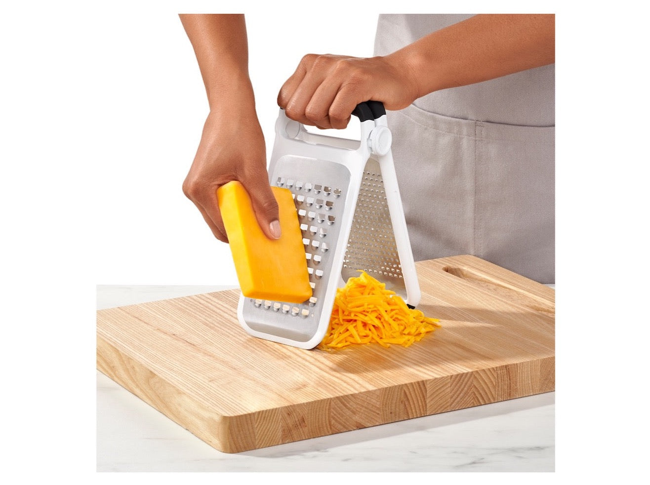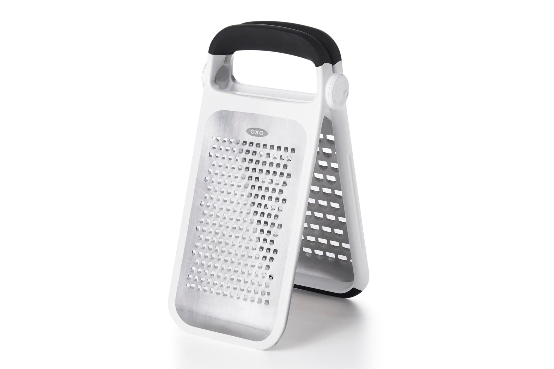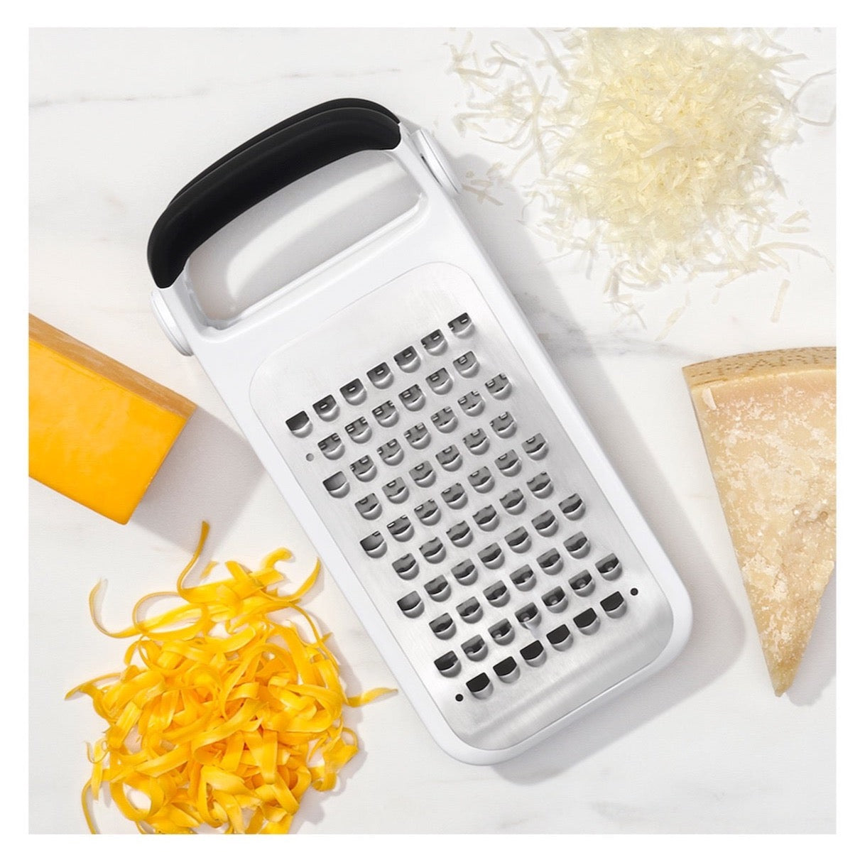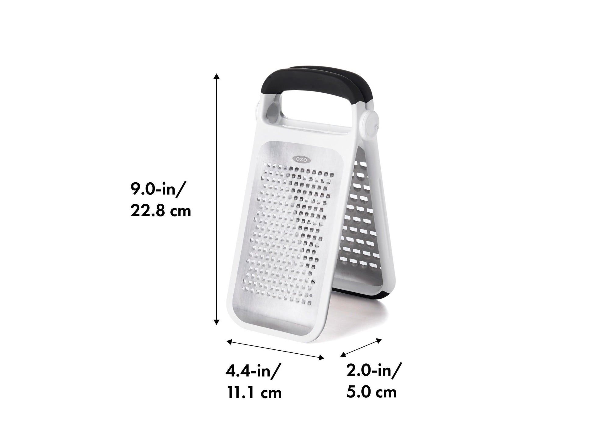 Die OXO Good Grips 2-in1-Küchenreibe besitzt extra scharfe Oberflächen aus geätztem Edelstahl für grobes und mittelfeines Reiben von Käse, Gemüse und Schokolade. Abtrennbare Reibeflächen können zusammen über ein Schneidebrett oder einzeln über eine Schüssel verwendet werden. Rutschfeste Füße sorgen für guten Halt. Das Prunkt ist spülmaschinenfest im oberen Geschirrbereich.