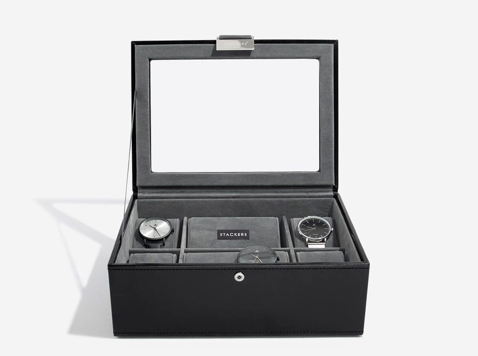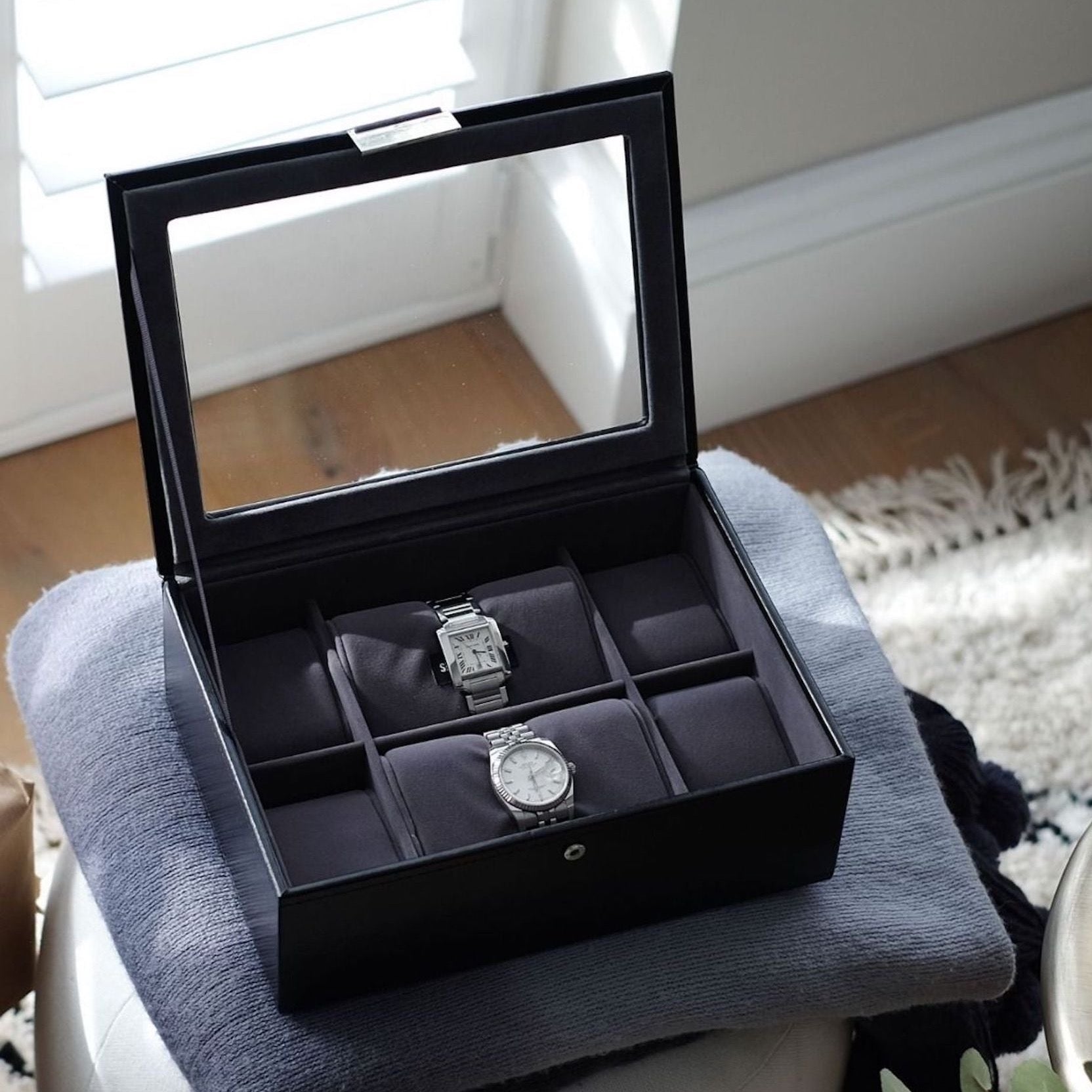 Für den begeisterten Uhrensammler. Halten Sie Ihre Uhrensammlung organisiert und sicher mit einer unserer Uhrenboxen. Sie verfügt über einen klaren Glasdeckel, um Ihre Uhren sicher und sichtbar zu halten, und ein hochwertiges Baumwollfutter mit weichen Uhrenpads, um sicherzustellen, dass Ihre Uhren kratz- und staubfrei bleiben.