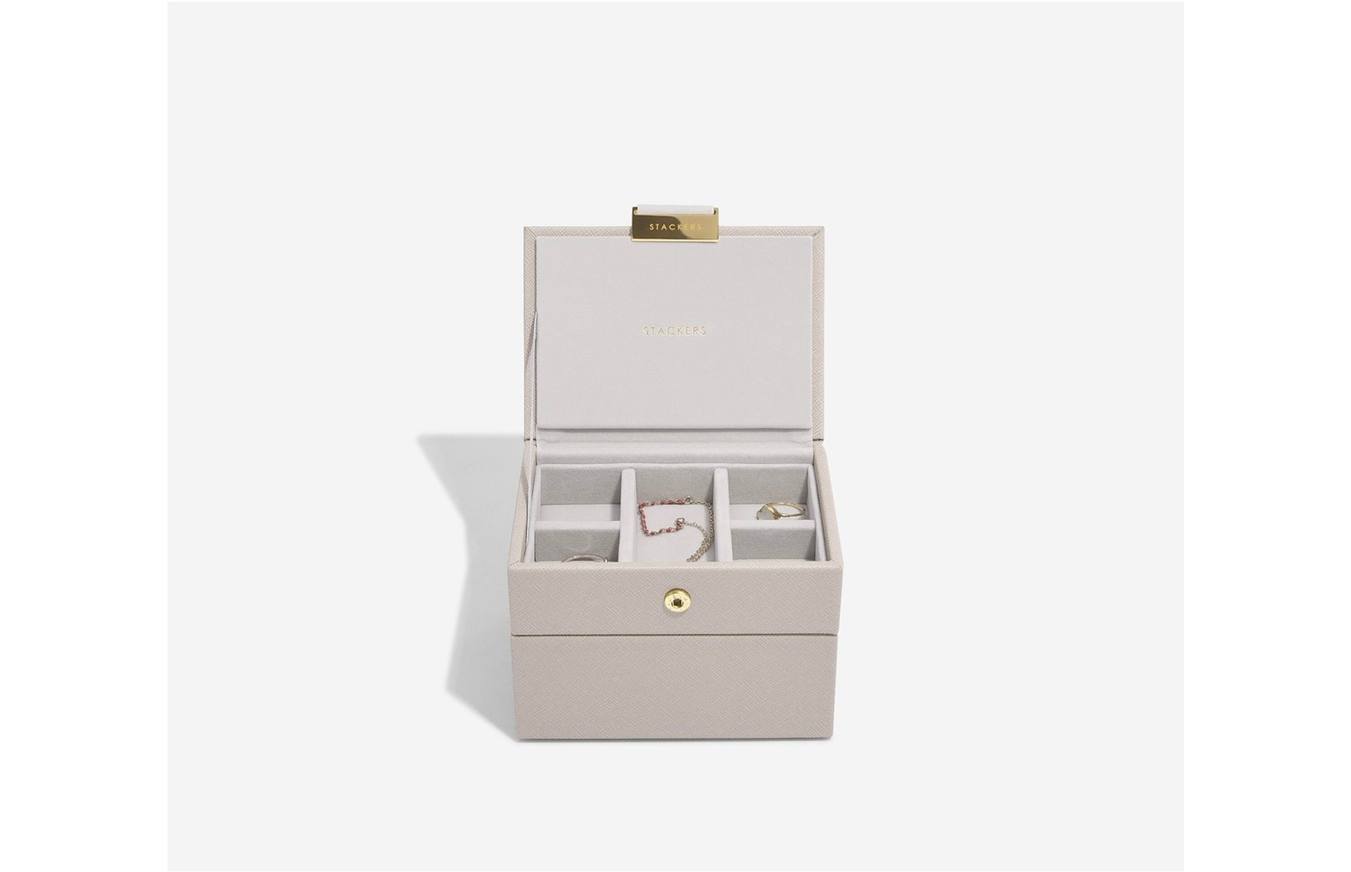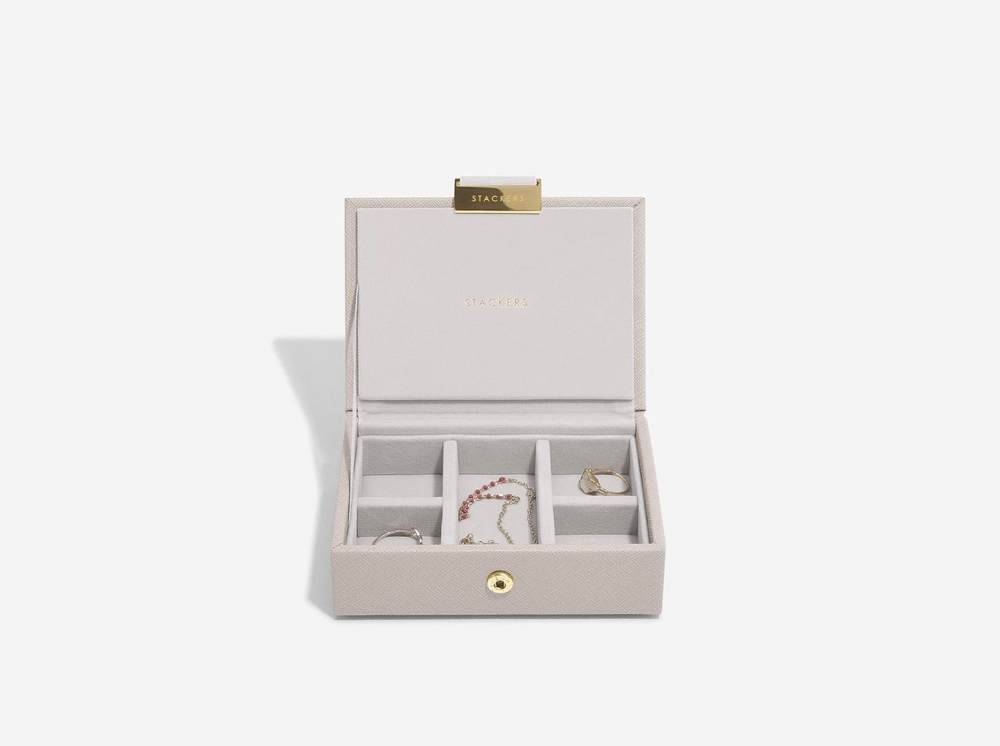 Die Stackers Micro Jewellery Box besteht aus zwei Fächern, dem Deckel der Micro-Schmuckschatulle, der über abnehmbare Trennwände für die vielseitige Aufbewahrung Deiner wertvollen Stücke verfügt. Die 5 Abschnitte bieten Platz für kleine Ketten oder Armbänder sowie Ohrringe und Ringe. Darunter befindet sich das mikrotiefe Zubehörfach mit einer abnehmbaren Ringrolle, darauf passen mehrere Ohrstecker und Ringe.