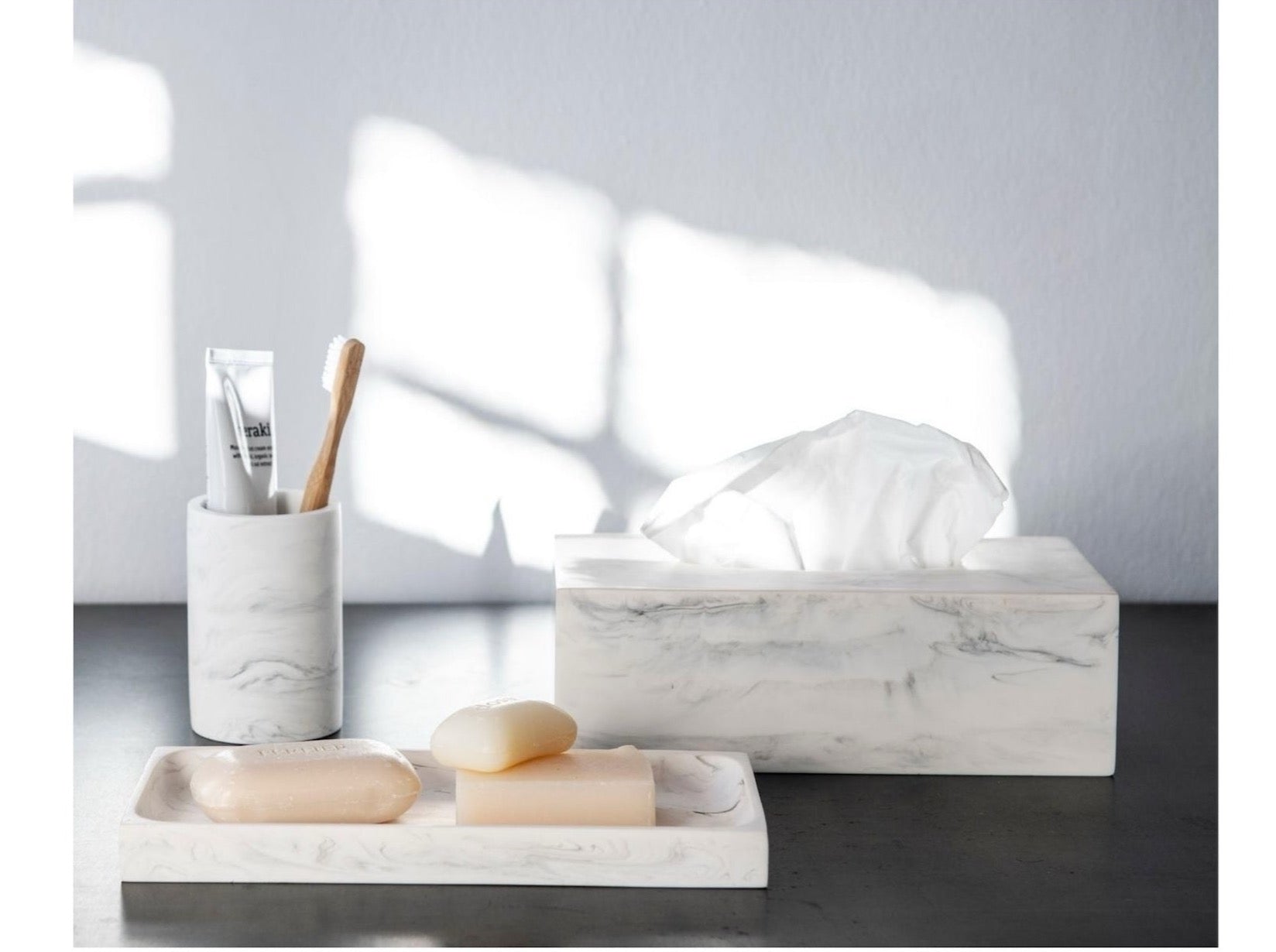 Diese Box hat eine breite obere Öffnung, um die Tücher bequem entnehmen zu können. Der untere Teil ist offen, so dass er über die Schachtel mit Papptaschentüchern passt.