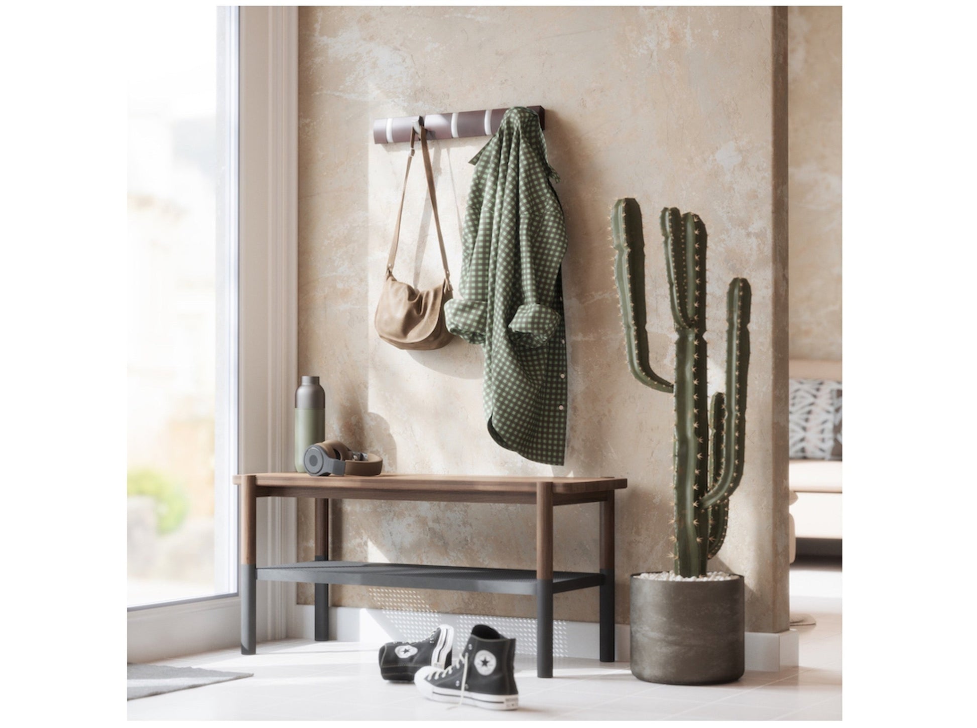 Flip ist eine moderne und funktionale Garderobenleiste die geräumigen Platz für Jacken und Accessoires im Flur, Schlafzimmer, Büro und Badezimmer bietet. Flip verfügt über klappbare Haken, die sich bei Nichtgebrauch einfach zurückklappen lassen. Trotz seines schlichten und raumsparenden Designs bietet Flip überraschend viel Platz und macht ihn zu einem perfekten Halter für Jacken, Schals, Taschen und Mehr. Flip lässt sich wirklich in jedem Raum in Ihrem Zuhause anbringen und dank des speziellen Designs ist die Aufhängung an der Rückseite nicht sichtbar, was Flip seinen schwerelosen und schwebenen Look verdankt.