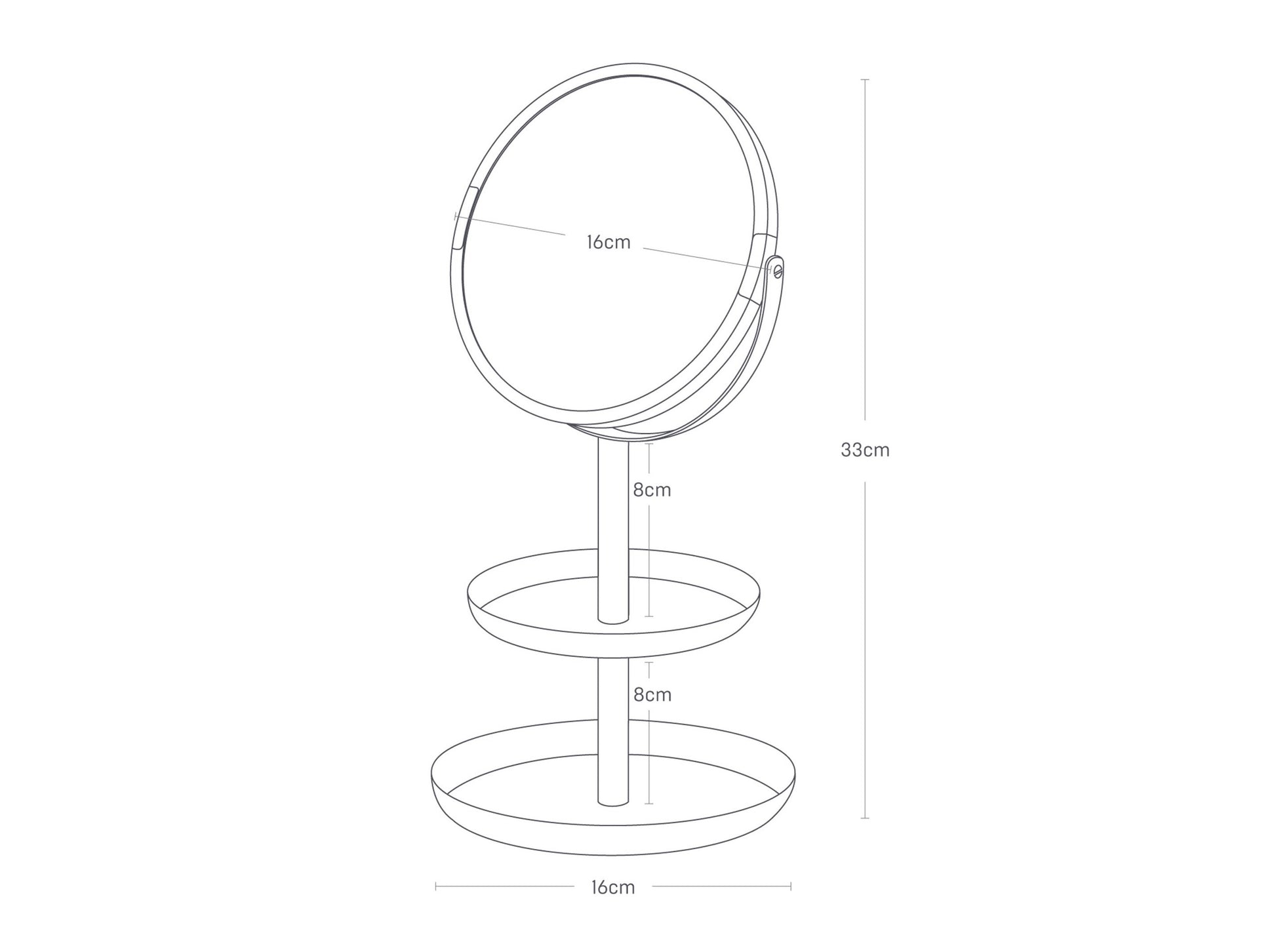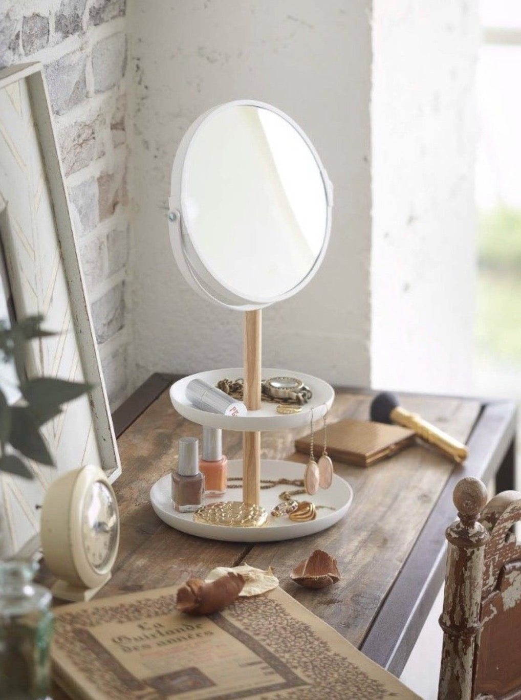 Diese Schmucketagere mit Spiegel von Yamazaki bietet Platz zur Aufbewahrung deiner Accessoires auf zwei Ebenen. Der drehbare Spiegel verfügt auf einer Seite über eine 3-fache Vergrößerung