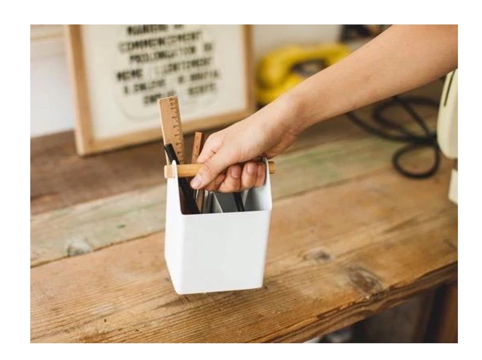 Mit dieser modernen Aufbewahrungsbox werden Schreibwaren und andere Utensilien auf besonders dekorative Weise sortiert. Die Kombination aus weißem Stahl und Naturholz ist eine elegante Ergänzung für jeden Raum und der Griff erleichtert den Transport.